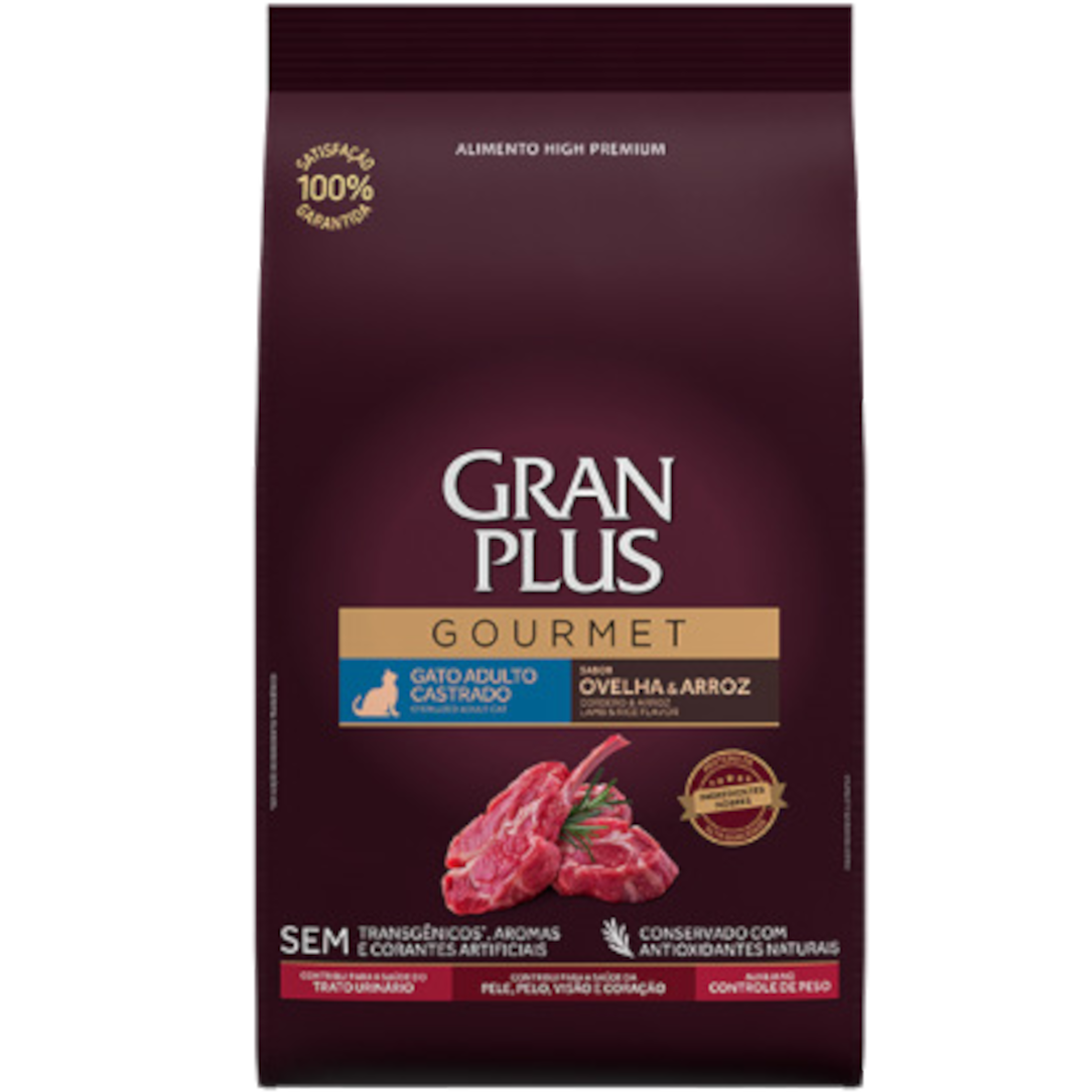 GRANPLUS Gourmet Gato Adulto Castrado Sabor Ovelha & Arroz é um alimento feito com ingredientes nobres e proteínas de alta qualidade, que proporcionam uma experiência de sabor para satisfazer os gatos com paladares exigentes, enquanto os nutre. Além disso, é conservado com antioxidantes naturais.