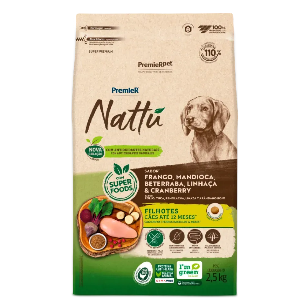 A ração Premier Nattu vem em embalagem de 2,5 kg, feita para oferecer uma alimentação balanceada para filhotes. Seu sabor natural e ingredientes selecionados proporcionam uma dieta rica e sem corantes ou conservantes artificiais relevantes. Ideal para cães em fase de desenvolvimento até 12 meses de idade.