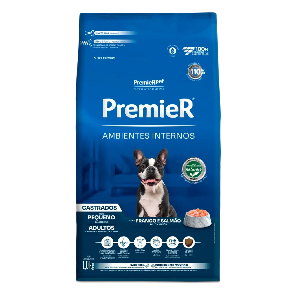 Ração destinada para cães adultos castrados que vivem em ambientes internos, com fórmula especial para saúde e bem-estar.