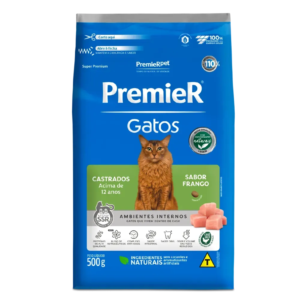 A embalagem contém 500 g de ração Premier para gatos castrados acima de 12 anos.