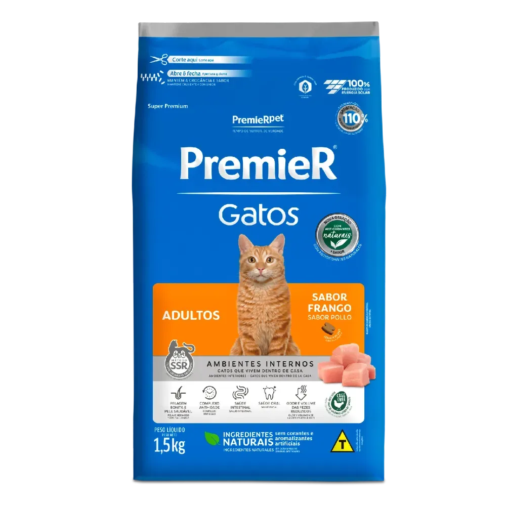 A ração Premier para gatos adultos possui 1,5 kg, balanceada para gatos que vivem dentro de casa, ajudando a preservar o sistema urinário e o bem-estar geral. Sua fórmula destaca a utilização de ingredientes naturais para uma nutrição equilibrada.