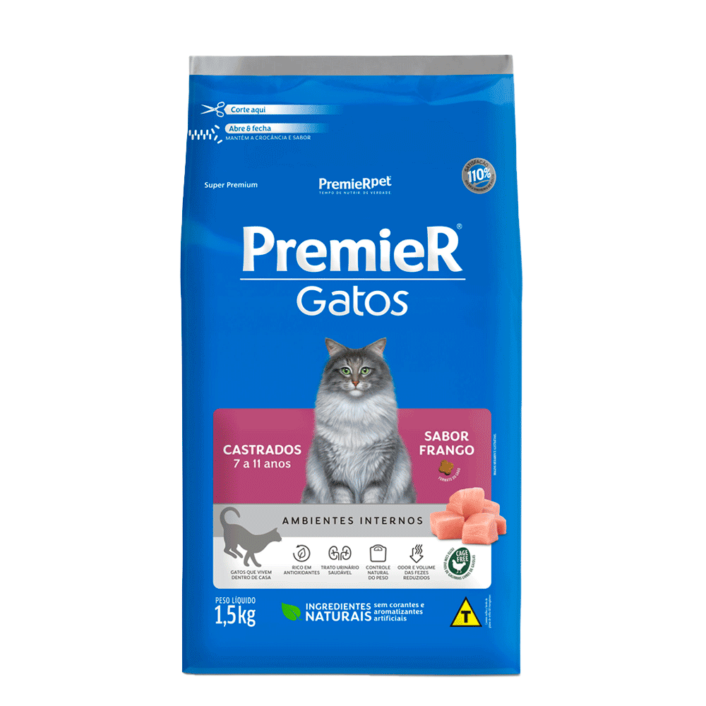 Ração seca Premier ideal para gatos castrados entre 7 e 11 anos, com sabor frango e fórmula ajustada para ambientes internos.
