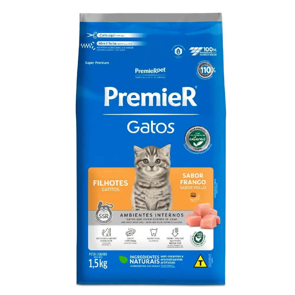 - Embalagem prática com sistema abre e fecha para conservar o alimento por mais tempo A ração Premier para filhotes oferece equilíbrio entre proteínas, vitaminas e minerais, permitindo um crescimento saudável e manutenção do bem-estar do seu gato dentro de casa. O peso líquido é de 1,5kg, ideal para porções diárias em filhotes.