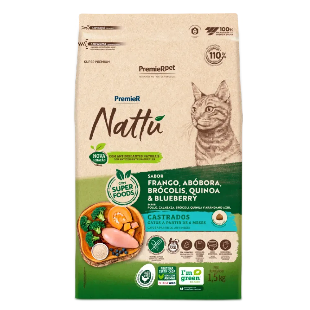 A ração tem sabor de frango com abóbora, brócolis, quinoa e blueberry, ideal para gatos exigentes. Embalagem contém 1,5 kg e é formulada com foco na saúde urinária e controle de peso, com ingredientes naturais. Produto indicado para gatos adultos castrados, proporcionando nutrição completa e equilibrada.