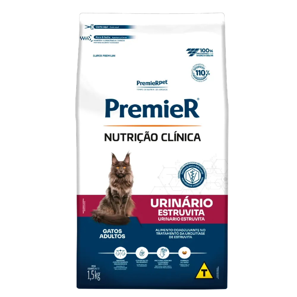 Ração Premier Nutrição Clínica Urinário é indicada para gatos adultos com necessidades especiais na saúde do trato urinário. Formulada para ajudar no controle da urolitíase, contribui para o equilíbrio urinário e o bem-estar do seu pet.
