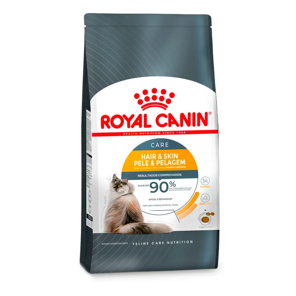 A ração Royal Hair & Skin Care é desenvolvida para cuidar da pele e pelagem dos gatos, ajudando a manter o pelo bonito e saudável.