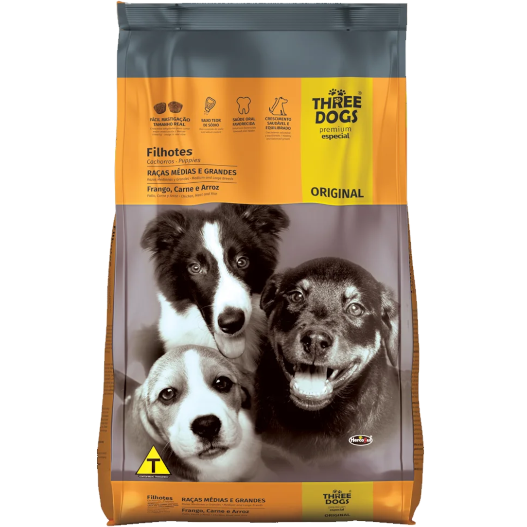 Three Dogs Premium Especial Original Filhotes de Raças Médias e Grandes é um alimento moderno e seguro, livre de corantes e aromatizantes artificiais que apresenta ótimo custo benefício. Sua receita é rica em ingredientes de elevada qualidade que favorecem proteínas, energia, vitaminas e minerais balanceados. Three Dogs Premium Especial Original Filhotes Raças Médias e Grandes também é indicado para fêmeas a partir da sexta semana de gestação até o desmame total dos filhotes.